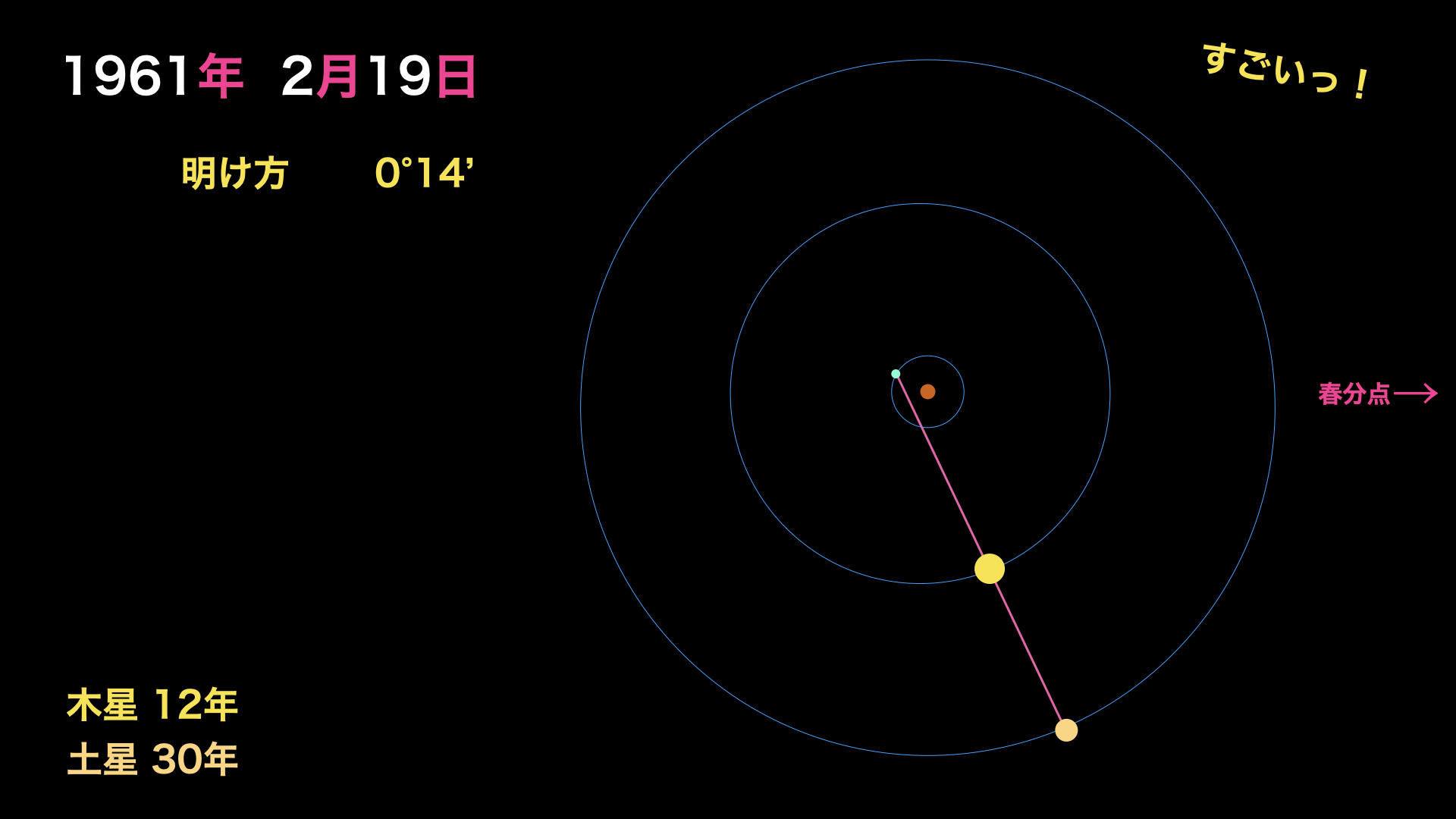 ㊍㊏ 木星が土星に内側から追いつくのにはなんと20年もかかります。そのイメージを動画にしました。音はなく、最初は1年ごとに止め、4年後からは延々と合計60周地球がまわり、木星は5周、土星は2周まわりほぼ元の位置に戻ります。この“60年ごと”は、この記事の下のほうの「すごい接近」の周期に関係してきます。