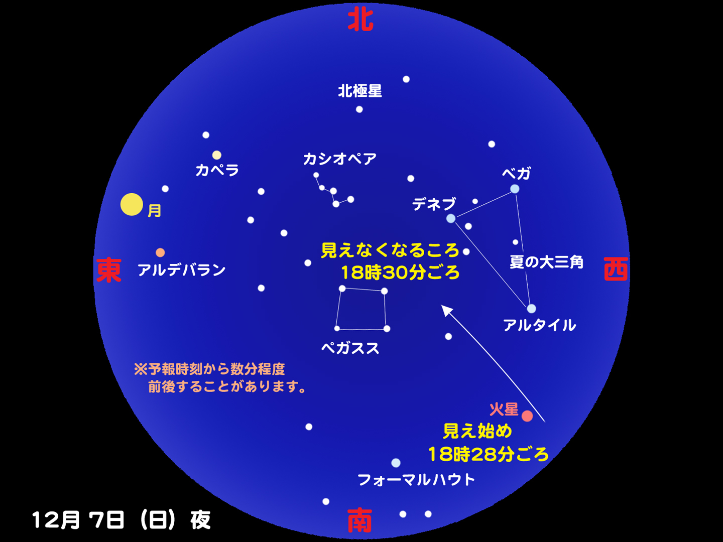 次回は12月25日以降です。近くなったら予報を公開します。12月 7日 18時28分頃から約2分間 最大高度60度 南西→高くなる