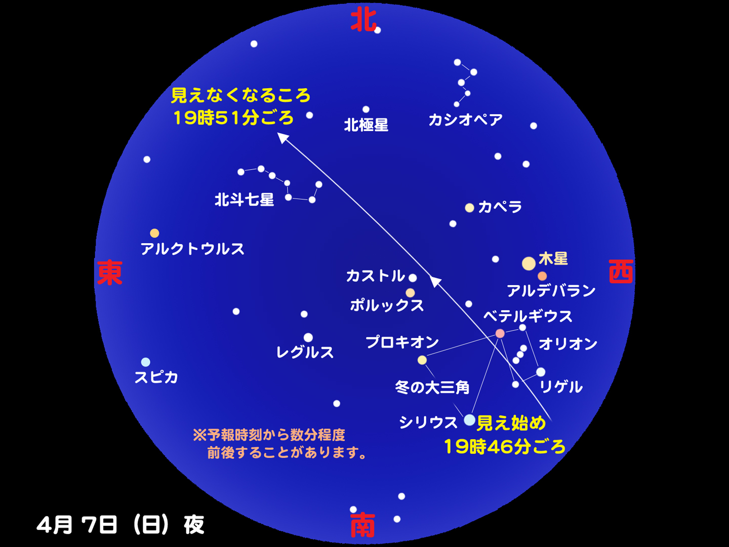 4月 7日 19時46分頃から約5分間 最大高度72度 南西→ほぼ真上→北東