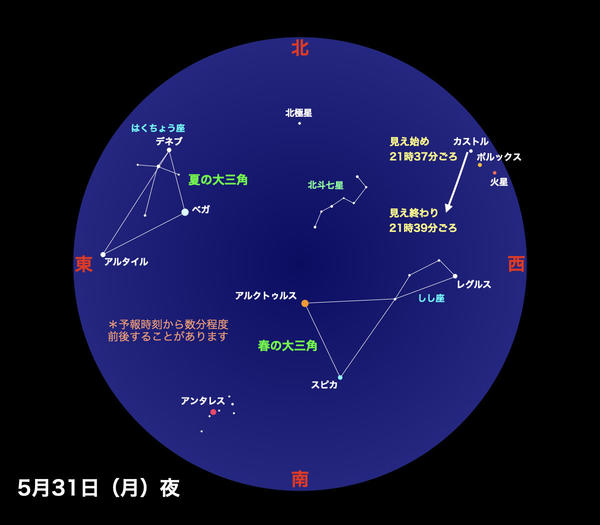 5月29日 21時36分から約2分間 最大高度30度 北西→北へ高くなりながら見えなくなる