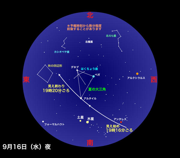 9月16日 19時16分頃から約4分間 最大高度64度 南西→南→東