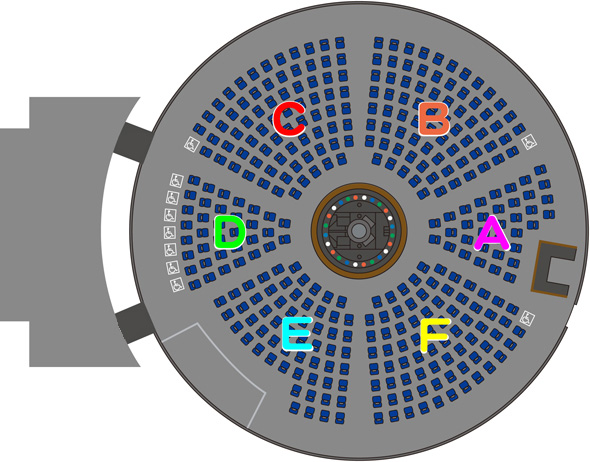 左右に30度回転できる独立したリクライニングシートが、350席設置されています。なお、普段の番組での座席は指定席となっていますので、番号をご確認の上、お座りください。