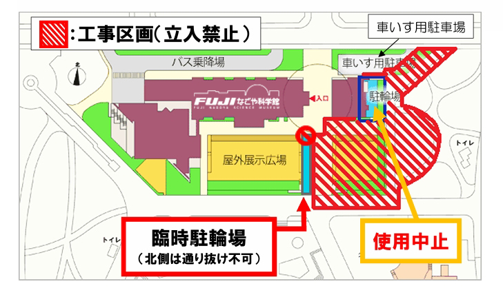 令和6年11月5日(火曜日)から令和8年2月中旬頃まで、科学館屋外展示場の工事に伴い、これまでの駐輪場がご利用できなくなります。