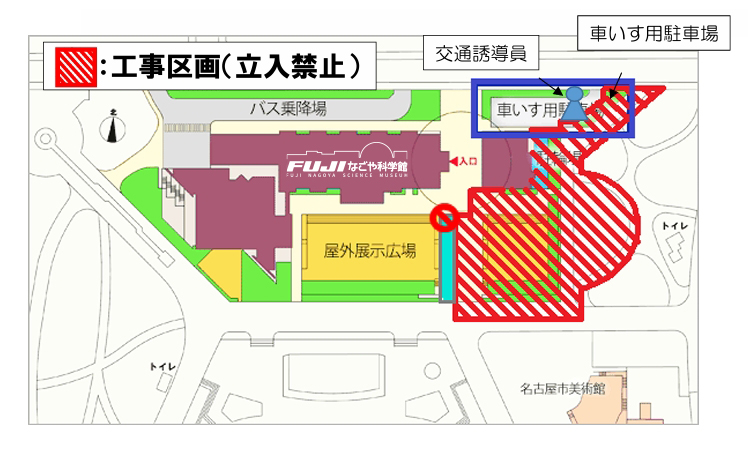 (令和6年11月5日(火曜日)から令和8年2月中旬頃まで、科学館屋外展示場の工事に伴い、工事期間中の車いす用駐車場の入口は、工事車両も使用しますが、これまでどおり車いす用駐車場の入口としてご利用いただけます。) - 車いすをご使用、または移動が困難な来館者に利用していただけます。ご利用の際は駐車場入口のインターホンよりお申し出ください。